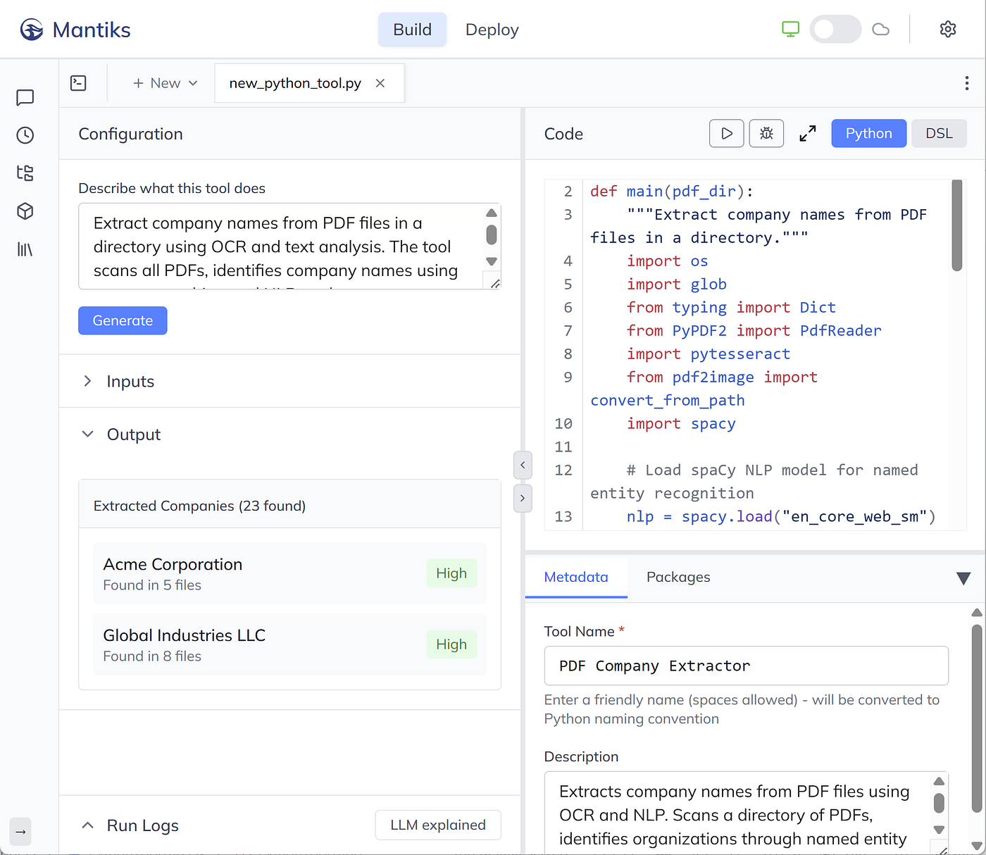 Instead of relying on an AI model every run, Mantiks generates real code that executes on your computer. That means it’s stable, auditable, and costs almost nothing to operate. Tasks happen first in a sandbox, so you can preview changes before they touch real files. Humans aren’t an afterthought — you can insert approvals or checks wherever they matter. And the AI support comes in at the right place: helping scaffold code and explain steps, while leaving you in control once it runs. There’s no lock-in either — you can use local or external models when you want, or none at all.